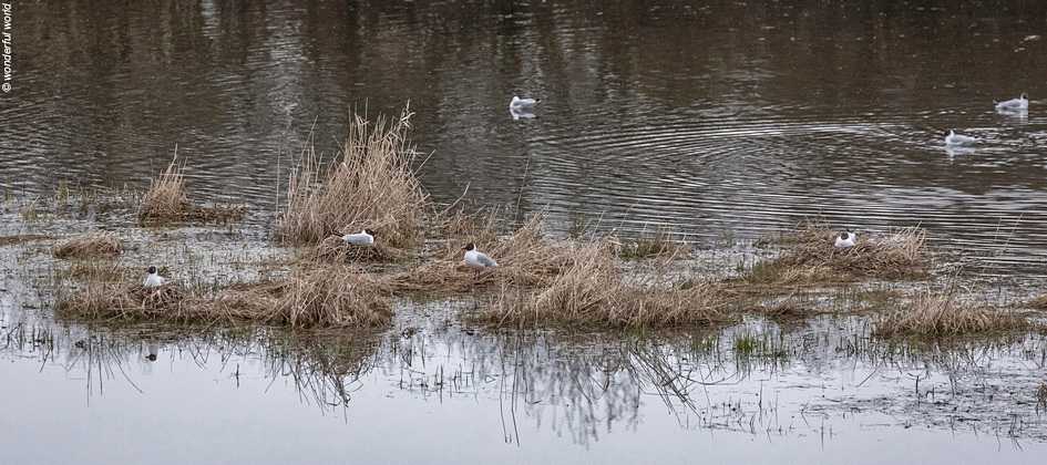 Чайки обосновались на маленьком болотном островке, устроили там гнезда и высиживают птенцов.