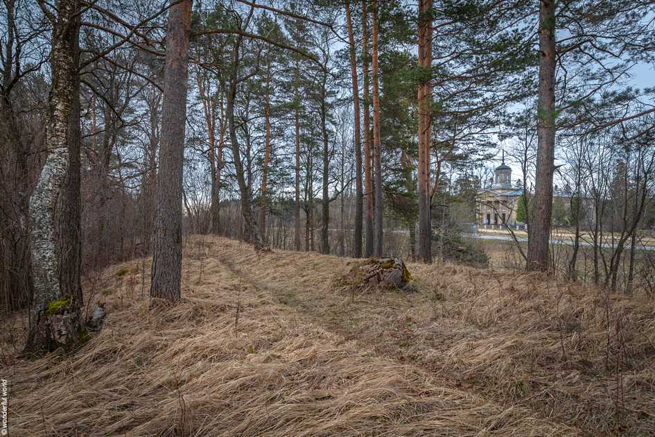 Напротив кирхи, через дорогу, – интересный берег Ижоры. Вдоль реки тянется бугор, поросший деревьями и кустами, по верху которого идет тропинка.