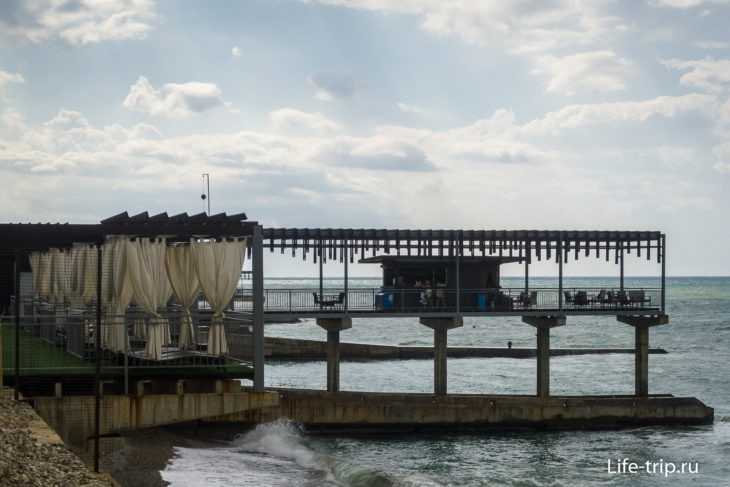 Санаторий Кавказ — отель с собственным пляжем в Сочи. Пляж неплохой в целом, но море тут конечно постаралось. Центр Кавказа размыт до такой степени, что его накрыли бетонными плитами. Получилась терраса, на которой для людей расставляют шезлонги. В принципе, обычное решение для сочинских пляжей. Хорошая инфраструктура и очень неплохой (по отзывам) отель первой линии в 10 метрах от моря.
