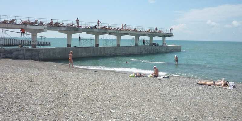 Названная локация обнаруживается между предыдущим местом купания и устьем Кудепсты – это 200 м, идущие вдоль шумного Сухумского шоссе. От него к морю ведет переход. Ширина периметра водного отдыха – 25 м, то есть вполне нормальная.
