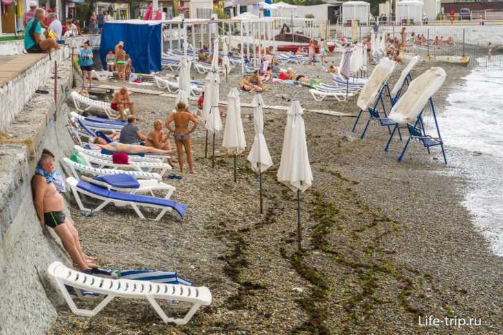 Кромка облагорожена новенькой набережной с парапетом с всякими торговыми павильонами-развалами. Имеются раздевалки и длинные общественные навесы, шатры и платные душевые, туалеты и сбегающие к самой воде деревянные настилы. В шаговой доступности известный всем туристам и местным жителям «веселый» бар.