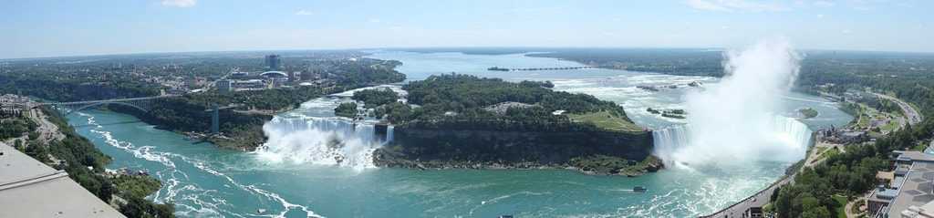 Ниагарские водопады. Вид с башни Скилон. Фото 19.9.2016 г.Прогулочный теплоход перед Ниагарским водопадом, вид с канадской стороныАмериканский водопад и водопад «Фата» (справа), снимок сделан с канадского берегаЛиния падения воды водопада «Подкова», снимок сделан с канадского берега