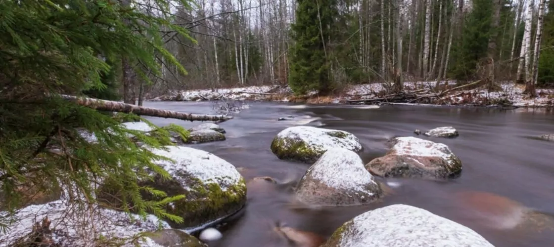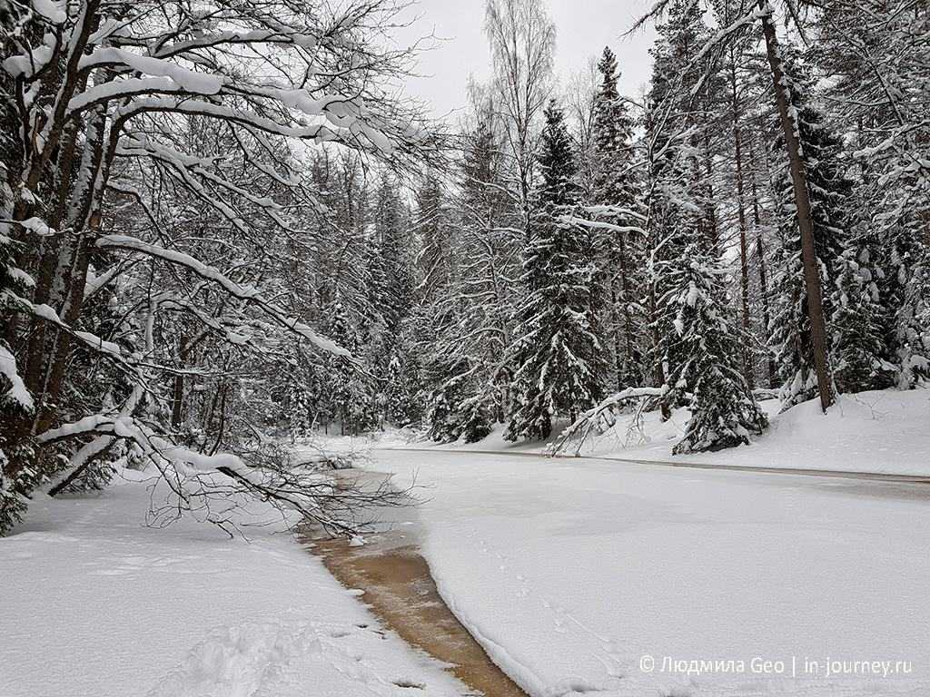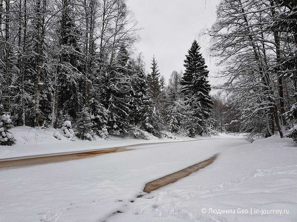 Интенсивное течение не дает речке замерзнуть до конца. Тем интереснее выглядят окрестности.