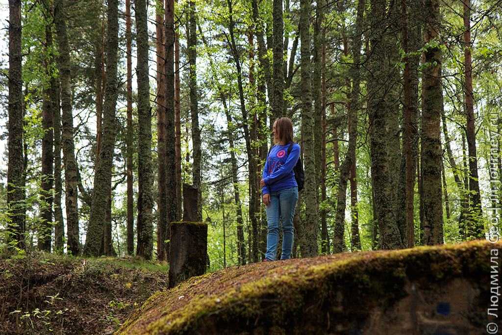 Все-таки у меня авторский блог, поэтому хочу рассказать немного о нашей поездке. Начну с самого начала. Перед тем, как поехать непосредственно в рощу, мы решили посмотреть на ДОТы недалеко от населенного пункта Серово. Прямо с парковки видна небольшая гора, высотой всего около 30 метров, на которую ведет песчаная тропинка. Забрались. Тут есть тайник, называющийся Гора Смерти. Взяв его, мы побрели дальше по лесной тропке.