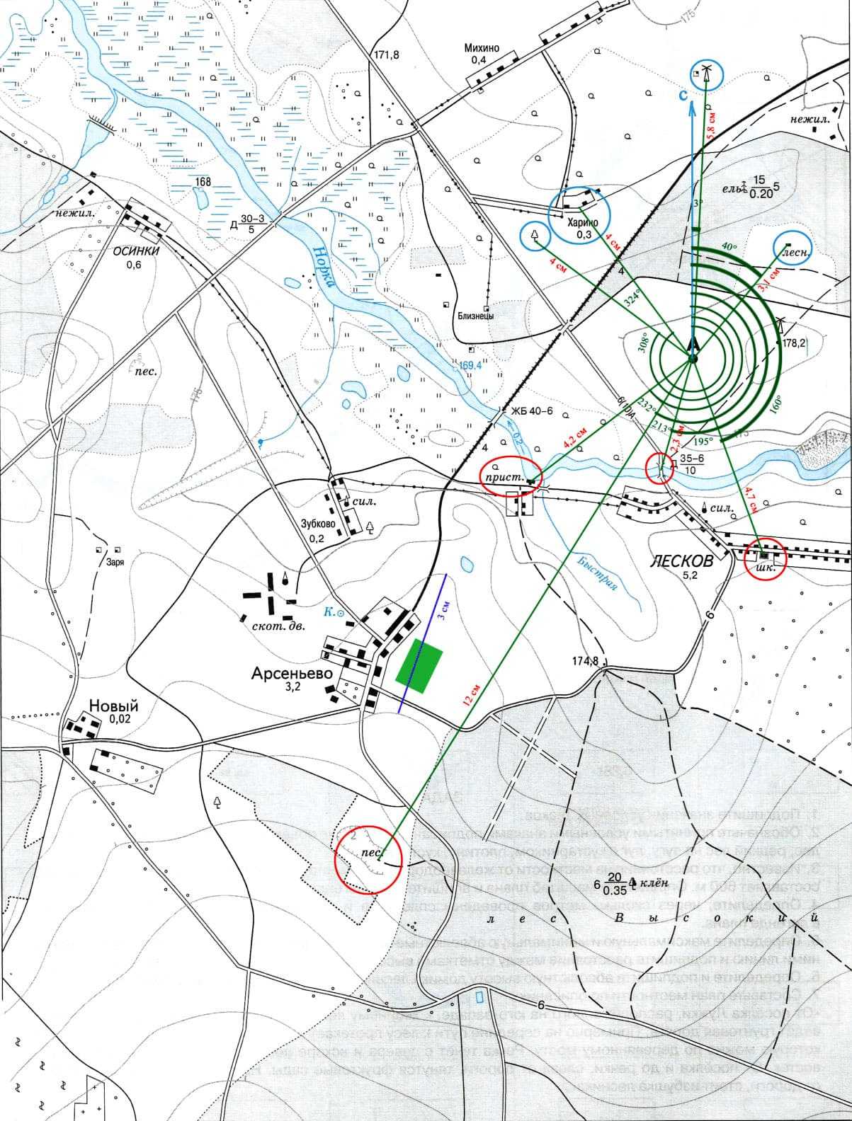 отдельно стоящее дерево 308° 400 метровпосёлок Харино 324° 400 метровмельница 3° 580 метровдом лесника 40° 310 метров школа 160° 470 метровмост 195° 230 метровпристань 232° 420 метровпесчаный карьер 213° 1200 метров