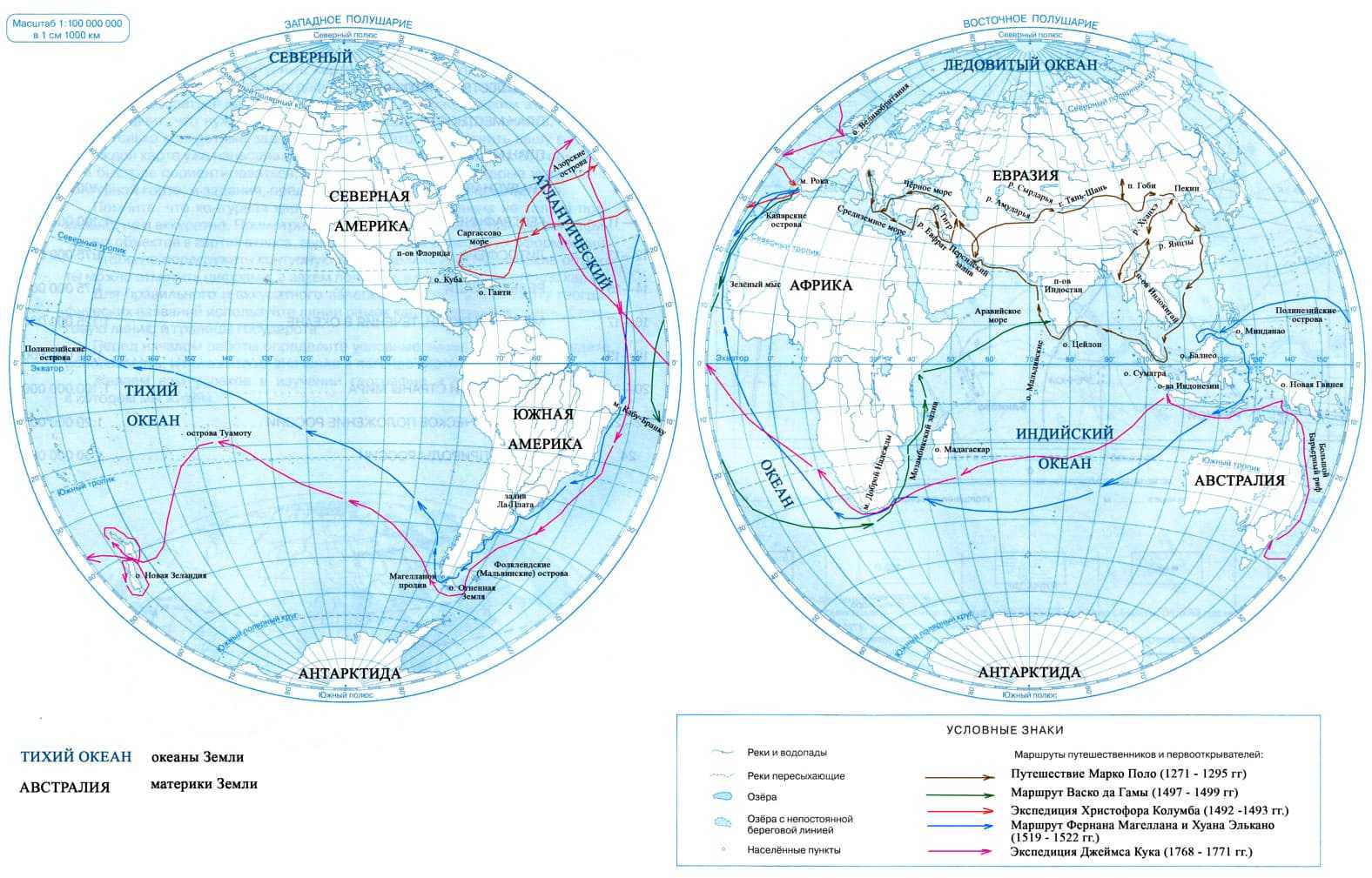 2. Предложите условные знаки и покажите стрелками разного цвета маршруты путешественников: Марко Поло, Васко да Гамы, Христофора Колумба (1492—1493 гг.), Фернана Магеллана и Джеймса Кука. В легенду карты внесите условные обозначения маршрутов и годы экспедиций.