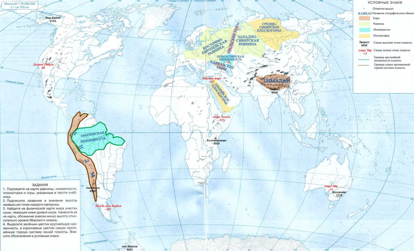 4. Выделите зелёным цветом крупнейшую низменность, а коричневым цветом самую протяжённую горную систему нашей планеты. Внесите обозначения в условные знаки.
