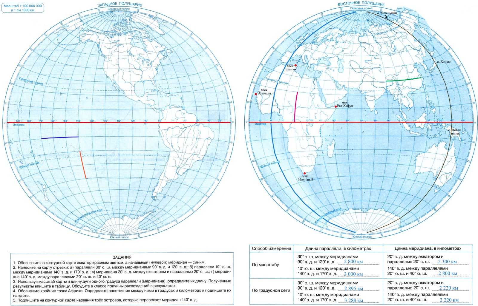 3. Используя масштаб карты и длину дуги одного градуса параллели (меридиана), определите их длину. Полученные результаты впишите в таблицу. Обсудите в классе причины расхождений в результатах.