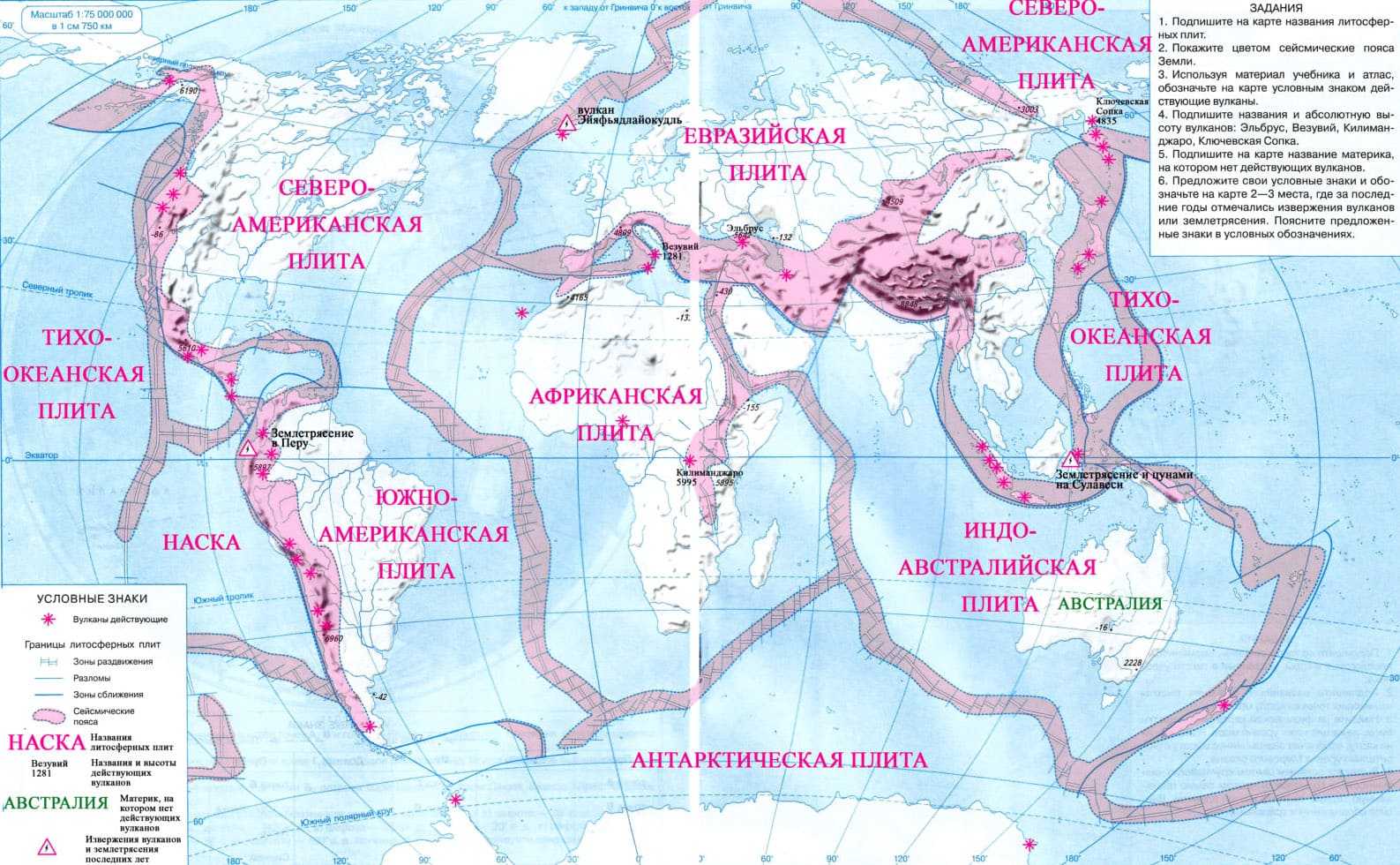 6. Предложите свои условные знаки и обозначьте на карте 2—3 места, где за последние годы отмечались извержения вулканов или землетрясения. Поясните предложенные знаки в условных обозначениях.