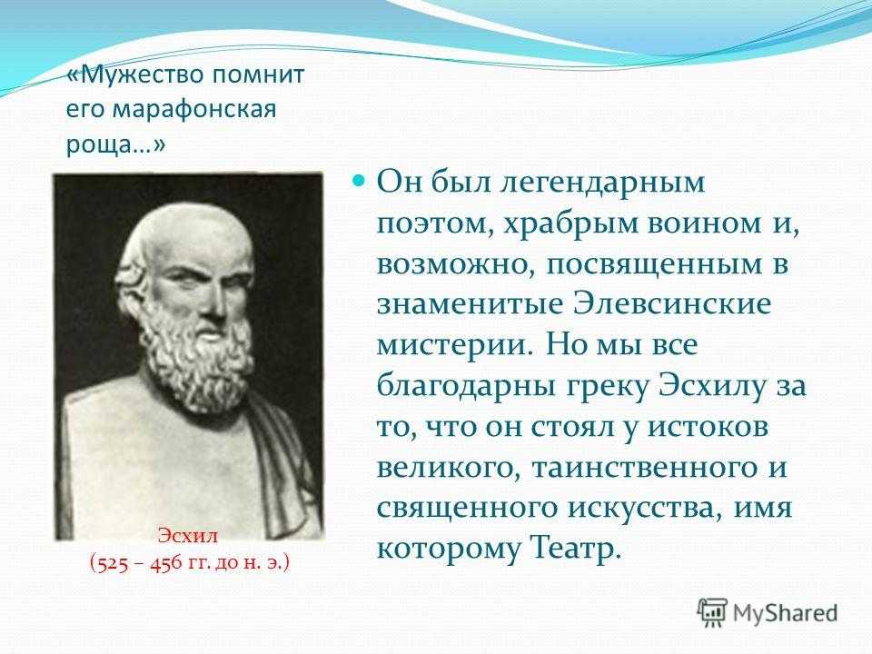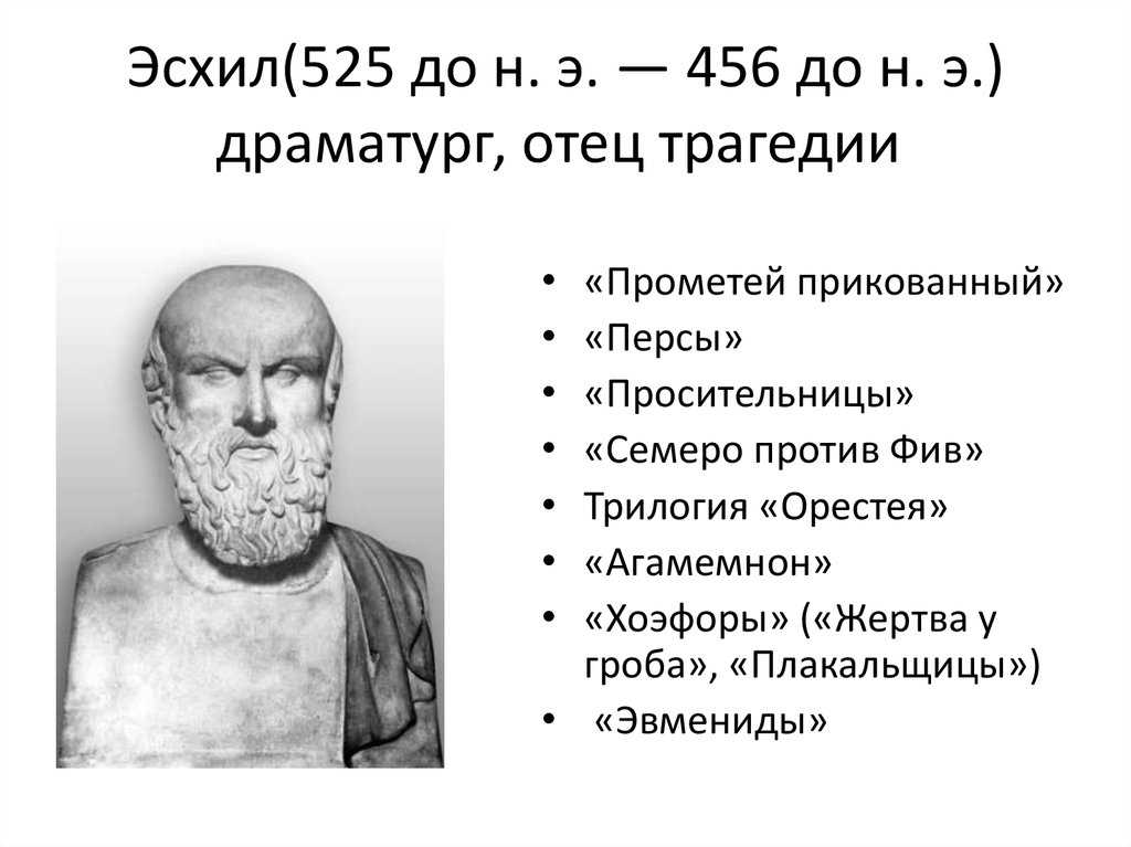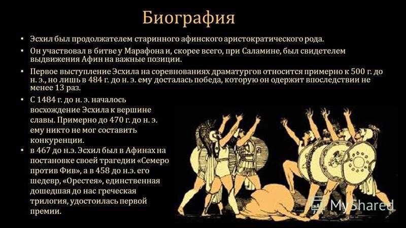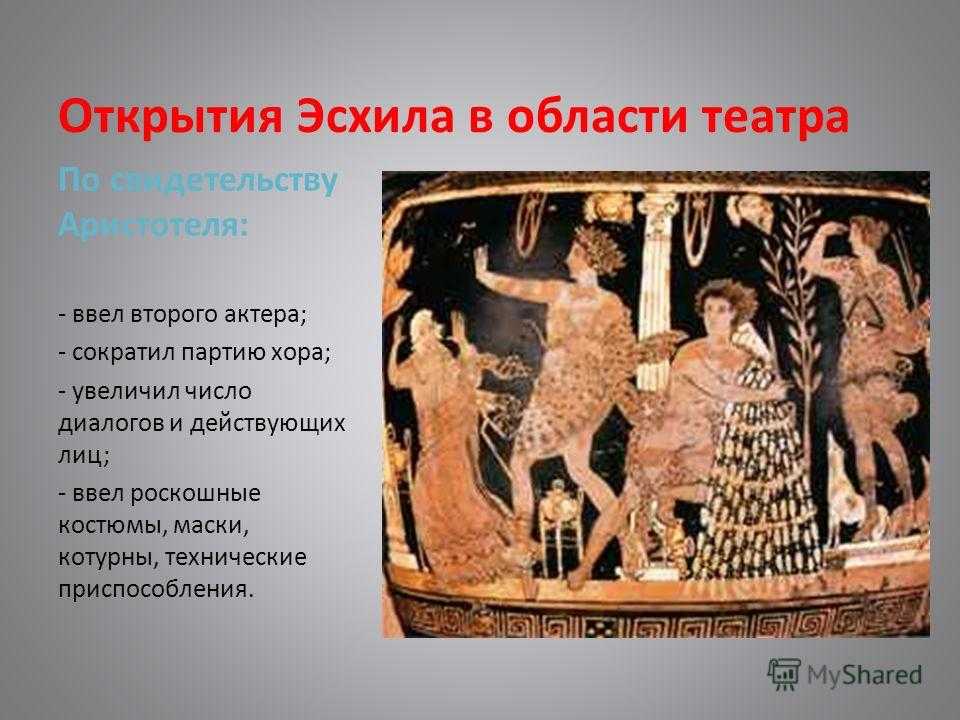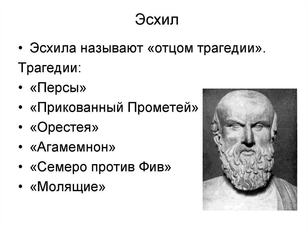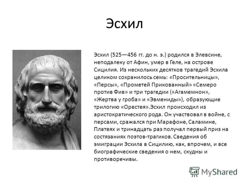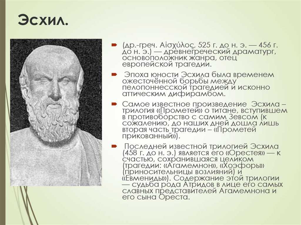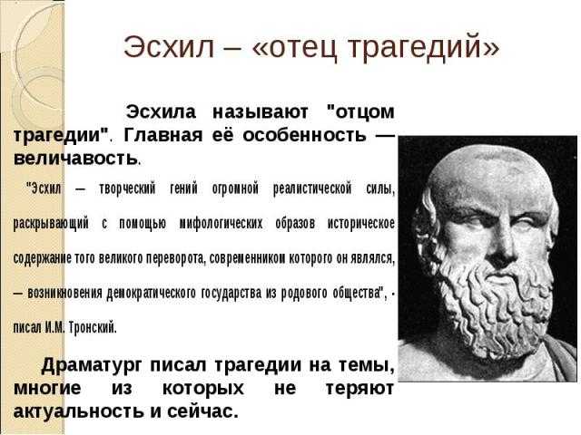 В краткой биографии Эсхила следует отметить, что он внёс новшества в развитие самой трагедии. Он добавил ещё одного актёра в действие, что позволило разыгрывать на сцене сложнейшие действия и истории.