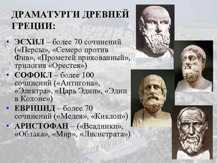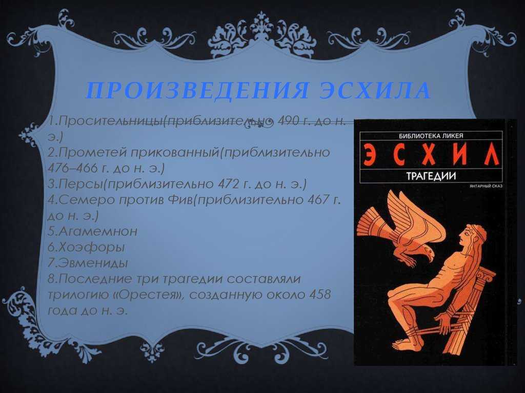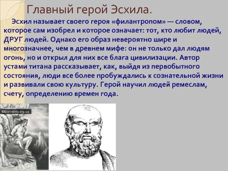 Автор не акцентирует внимание на конкретных личностях, он рассматривает их только как средство построения судьбы всего народа или государства.. Эсхил драматизирует конфликты, объясняет поведение человека сверхъестественным влиянием