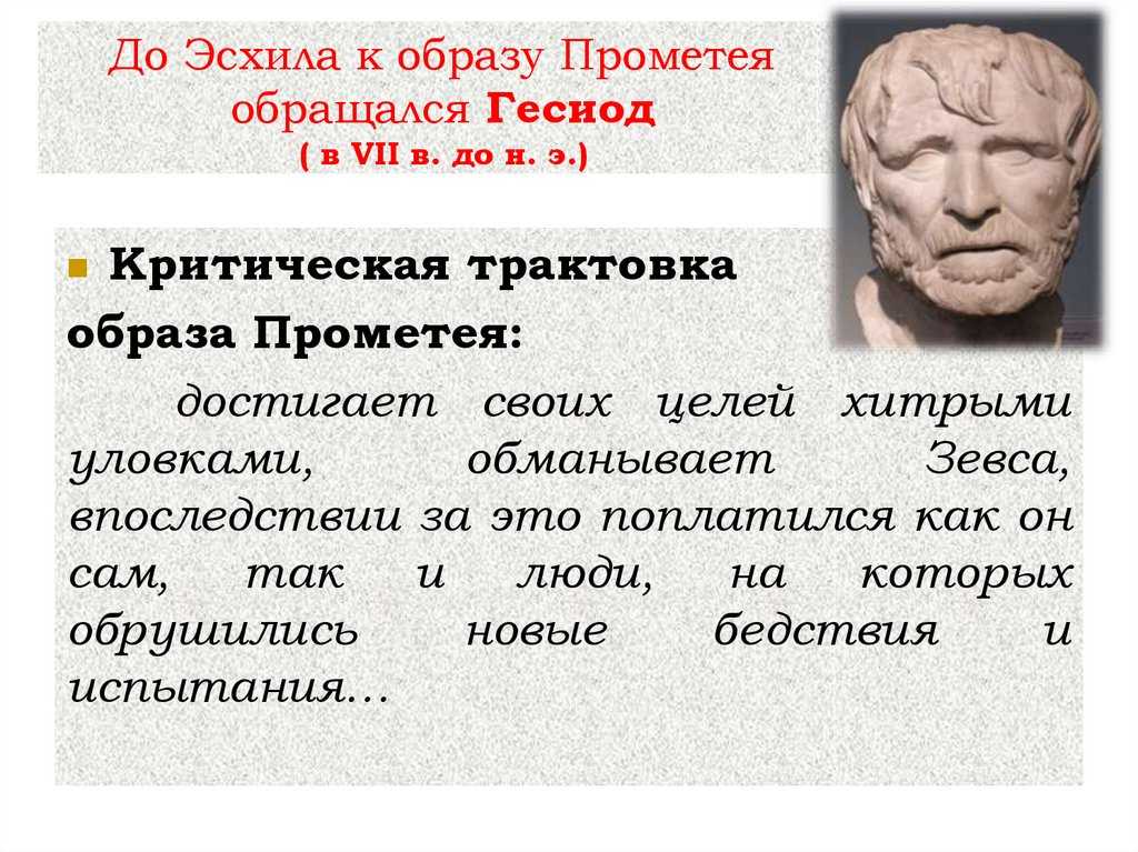 Узнав, что Зевс хотел полностью уничтожить людей, «чтобы новый род растить», Прометей стал единственным, кто встал на их защиту. Кроме того, он «у смертных отнял дар предвиденья», наделив слепыми надеждами. Но самое главное это то, что от Прометея люди получили величайший дар – огонь, с помощью которого овладели многими знаниями, ремеслами и искусствами.