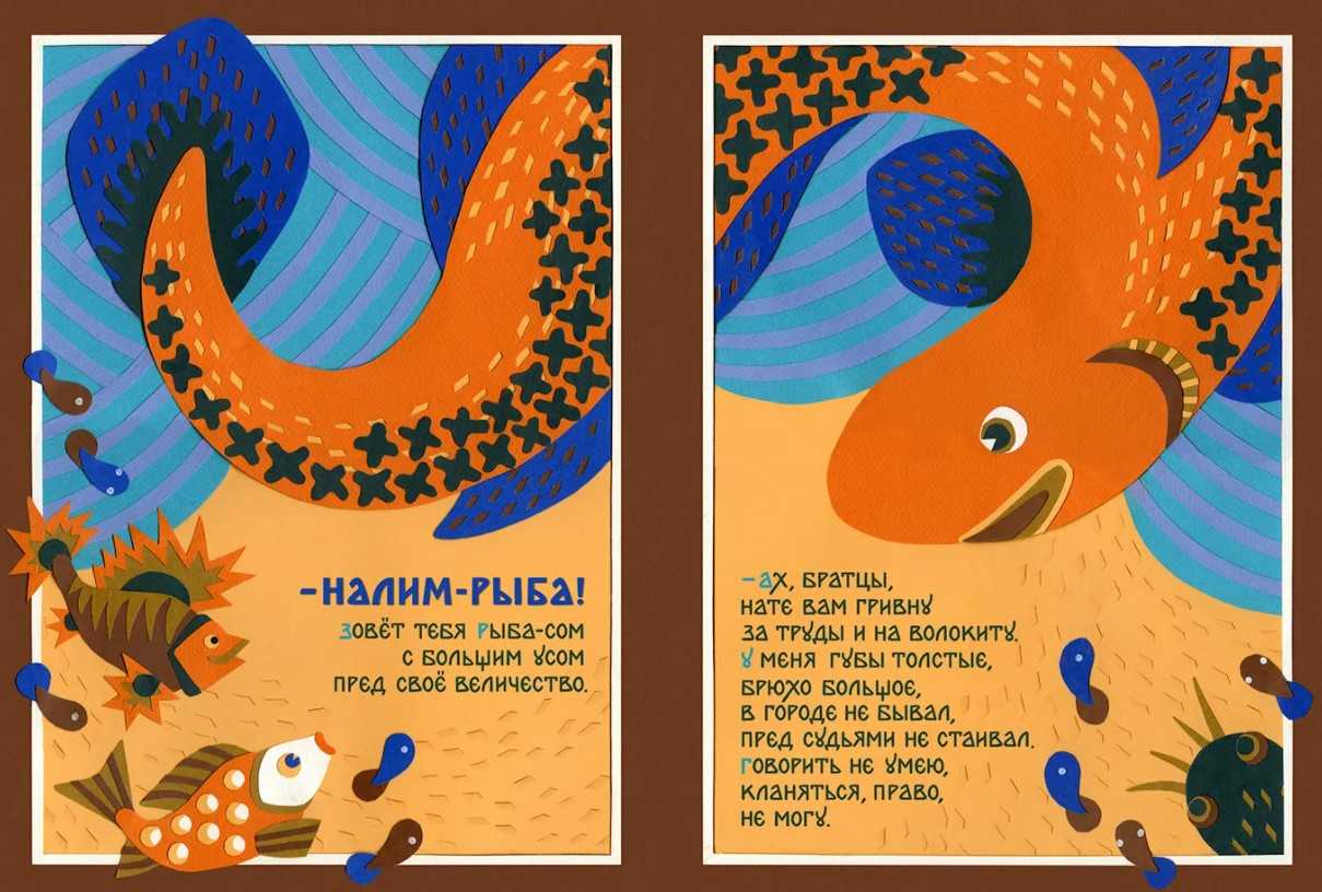 Ерш не унывает, а на Бога уповает: «Есть же, говорит, у меня в том свидетели и московские крепости, письменные грамоты: налим-рыба на пожаре был, головешки носил, и понынче он черен». Стрелец-рыба, карась-палач, две горсти мелких молей, туды же понятых (это государские посылыцики), приходят к налим-рыбе и говорят: «Налим-рыба! Зовет тебя рыба-сом с большим усом пред свое величество».— «Ах, братцы! Нате вам гривну на труды и на волокиту; у меня губы толстые, брюхо большое, в городе не бывал, пред судьям не стаивал, говорить не умею, кланяться, право, не могу». Эти государские посылыцики пошли домой; тут поймали ерша и посадили его в петлю.