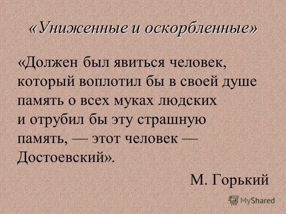 Достоевский этими образами хочет показать, что быть униженным и оскорбленным может каждый человек, ведь в жизни случается всякое. Однако у всего есть разумный предел, и синдром патологической жертвы не делает жизнь счастливее.
