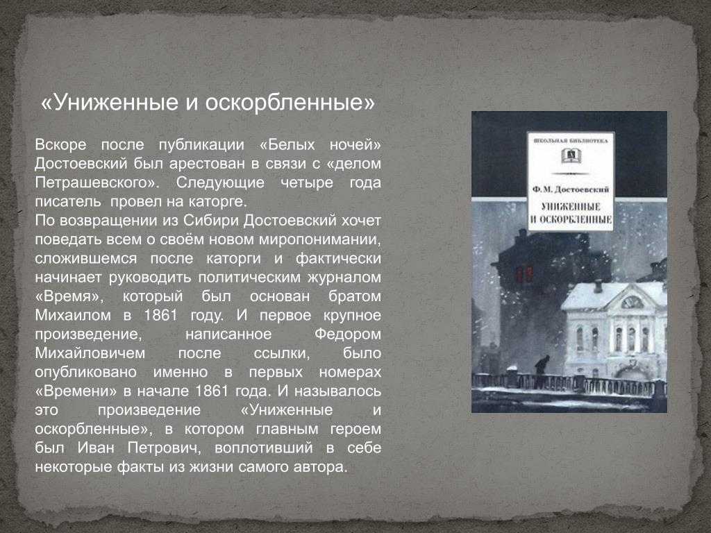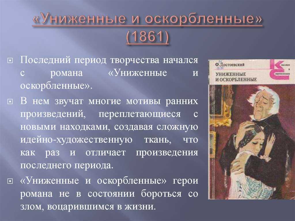 «Униженные и оскорбленные» Достоевского стало первым серьезным произведением, где писатель отразил проблемы и устои эпохи. Тема романа — бедняки, оказавшиеся без необходимой поддержки и покровительства. Они обездолены и унижены более влиятельными и властными людьми, на стороне которых — деньги и закон. Критики встретили роман сдержанно. Причиной этому стало, скорее всего, недавнее возвращение писателя из ссылки. Только журнал «Современник» дал положительную характеристику, указав при этом на недостатки.