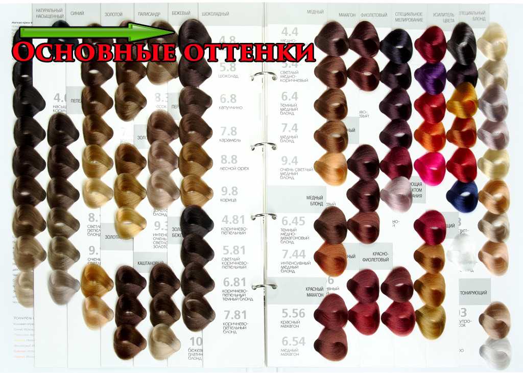 Палитра оттенков: 0-натуральный; 1-пепельный; 3-золотистый; 4-медный; 5-красный; 6-фиолетовый; 7-коричневый; 8-жемчужный.