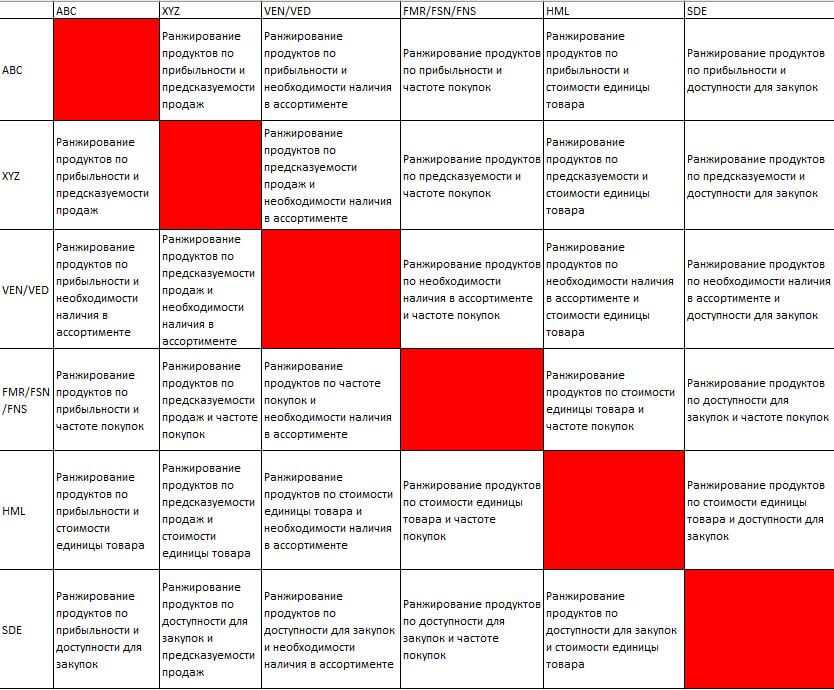 В современной экономической литературе существует восемь известных методов анализа ассортимента: «ABC; XYZ; FSN/FNS/FMR; RFM; VED/VEN; QRS; HML; SDE».