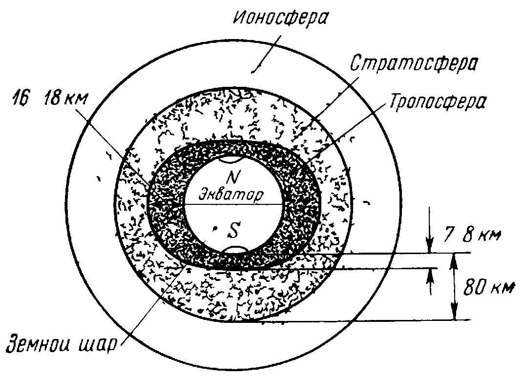Тропосферой называется нижний слой атмосферы. Толщина ее над полюсами 7 — 8 км, над экватором 16 — 18 км, высота верхней границы изменяется в зависимости от характера поверхности Земли, атмосферных процессов, теплового состояния воздуха, а также от суточных и годовых изменений. Температура воздуха в тропосфере с подъемом на высоту падает (6,5° на каждые 1000 м), так как нагрев воздуха обусловливается основном отраженными от земной поверхности солнечными лучами. Изменение температуры воздуха с высотой приводит к перемещению воздушных масс, холодные верхние слои опускаются, а теплые поднимаются. Вследствие этого образуются облака, выпадают осадки, дуют ветры. Из-за перемещения воздушных масс состав воздуха тропосферы практически постоянен. В нем содержится 78% азота, 21% кислорода и около 1% других газов (аргон, углекислый газ, водород, неон, гелий). Кроме указанных газов в тропосфере сосредоточен почти весь водяной пар, находящийся в непрерывном кругообороте (испарение — конденсация и кристаллизация с облакообразованием — осадки). В нижних слоях тропосферы множество различных примесей в виде мельчайших твердых частиц (пыль). Содержание в воздухе тропосферы водяного пара и пыли приводит к ухудшению видимости.