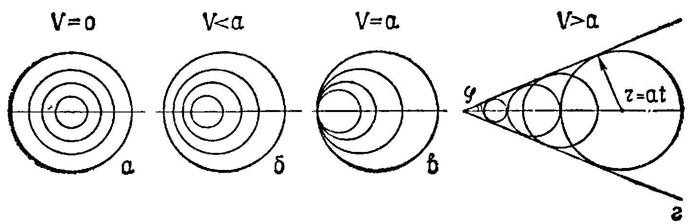 При движении точечного источника возмущения со скоростью, меньшей скорости звука, звуковые волны идут как вперед, так и назад (рис. б) В результате сферические волны будут смещены в сторону, обратную движению источника возмущений, однако источник останется внутри сфер.