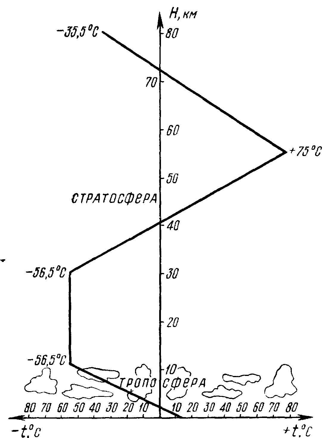 Стратосфера — слой воздуха, лежащий непосредственно над воздушными слоями тропосферы. В ней наблюдается полное отсутствие облаков и наличие сильных ветров, дующих с большой скоростью и в одном направлении. Вертикальные перемещения воздушных масс отсутствуют. В стратосфере с высоты: на экваторе — 17 км, полюсе — 8 км, средней широте — 11 км и до высоты в среднем 25…30 км температура постоянна и составляет -56°С. С высоты 30 км и до 55 км температура воздуха повышается до +75°С вследствие повышенного содержания озона, который обладает способностью поглощать ультрафиолетовое излучение. С высоты 55 км и до 80 км температура воздуха понижается в среднем на 4°С на каждые 1000 м из-за уменьшения процентного содержания озона в воздухе. На высоте 82…83 км температура воздуха составляет -35°С (рис. 2).