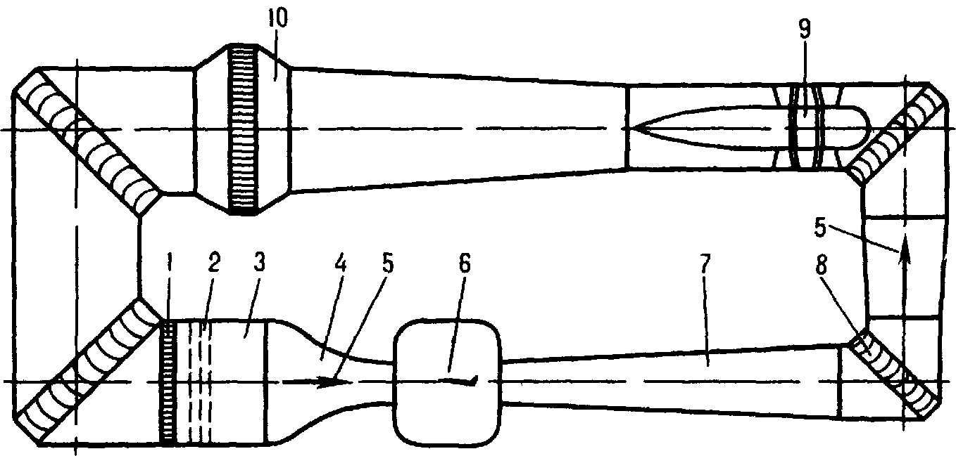 1- хонейкомб 2 — сетки 3 — форкамера 4 — конфузор 5 — направление потока 6 — рабочая часть с моделью 7 — диффузор, 8 — колено с поворотными лопатками, 9 — компрессор 10 — воздухоохладитель