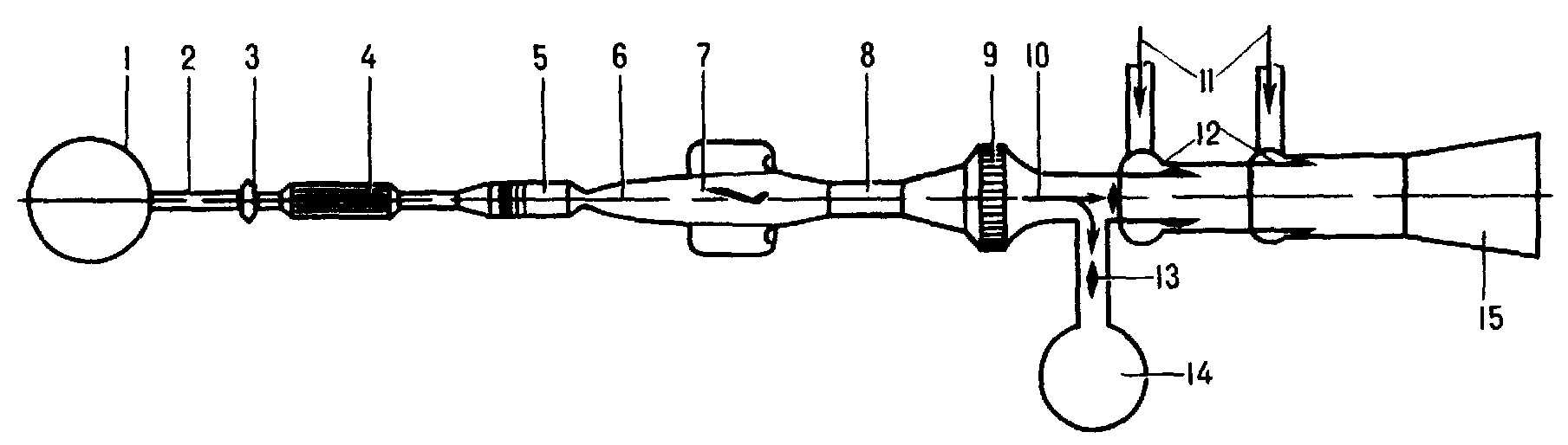 1 — баллон с высоким давлением 2 — трубопровод 3 — регулирующий дроссель 4 — подогреватель 5 — форкамера с хонейкомбом и сетками 6 — гиперзвуковое осесимметричное сопло 7 — рабочая часть с моделью 8 — гиперзвуковой осесимметричный диффузор 9 — воздухоохладитель 10 — направление потока 11 — подвод воздуха в эжекторы 12 — эжекторы 13 — затворы 14 — вакуумная емкость 15 — дозвуковой диффузор