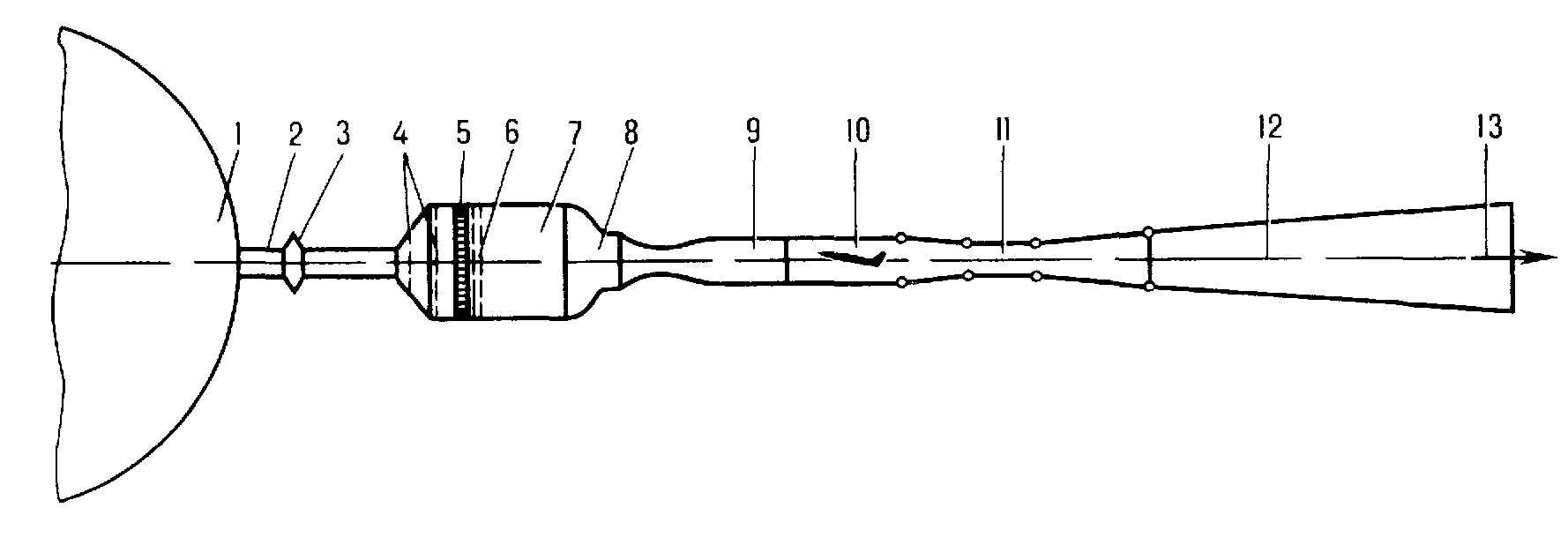 1 — баллон со сжатым воздухом 2 — трубопровод 3 — регулирующий дроссель 4 — выравнивающие сетки 5 — хонейкомб 6 — детурбулизирующие сетки 7 — форкамера 8 — конфузор 9 — сверхзвуковое сопло 10 — рабочая часть с моделью 11 — сверхзвуковой диффузор 12 — дозвуковой диффузор 13 — выброс в атмосферу