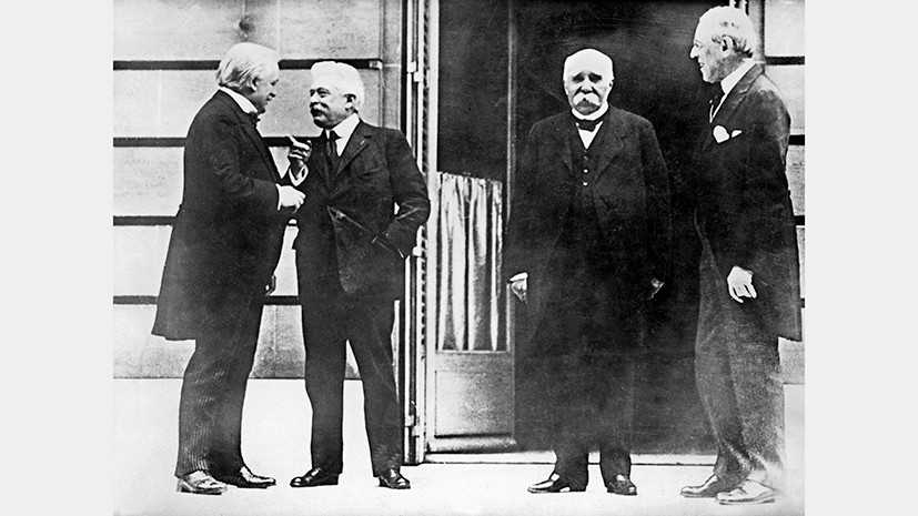 Открытие Парижской конференции. Январь 1919 года. Премьер-министр Великобритании Дэвид Ллойд-Джордж, председатель совета министров Италии Витторио Орландо, премьер-министр Франции Жорж Клемансо, президент США Вудро Вильсон AFP