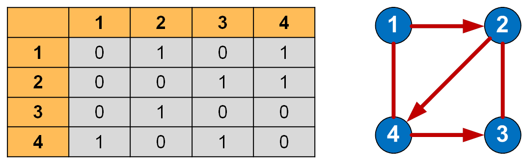 - Матрица смежности. Это матрица n×n где n — число вершин, где bij = 1, если существует ребро, идещее из вершины х в вершину у и bij = 0 в противном случае.