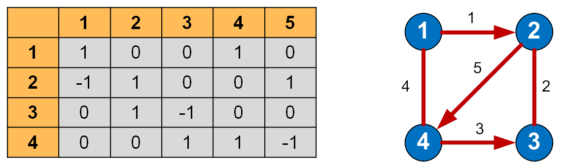 В ориентированном графе если ребро выходит из вершины, то соответствующий элемент равен 1, если ребро входит в вершину, то соответствующий элемент равен -1, если ребро отсутствует, то элемент равен 0.
