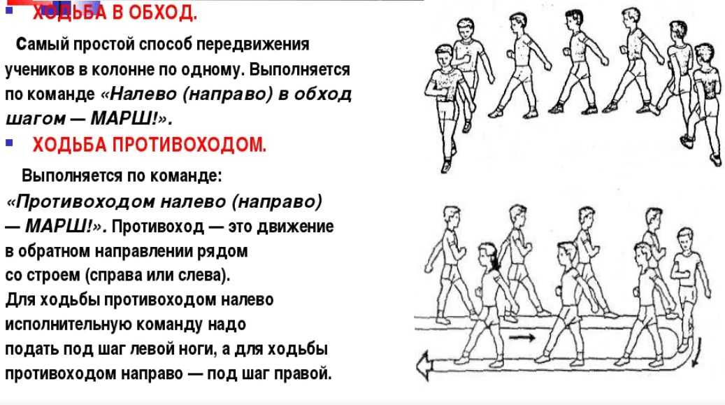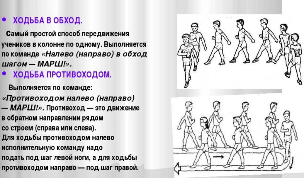 При этом учитывается тот факт, что шаги подразделяются на строевые и походные. В первой ситуации осуществляется команда «Строевым шагом – Марш!», во второй ситуации – «Шагом – Марш». По первичной команде тело немного выдвигается вперёд, весь вес идёт на правую ногу, позиция должна быть устойчивой. После получения команды требующей незамедлительного исполнения, следует двигаться с левой ноги и полным шагом.
