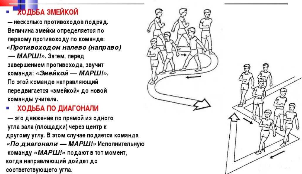 - По диагонали. Команда «По диагонали – МАРШ!», выполняется только в той ситуации, если спортсмены подходят к углу зала. Получив указание тренера, гимнасты, за направляющим, передвигаются к другому углу.