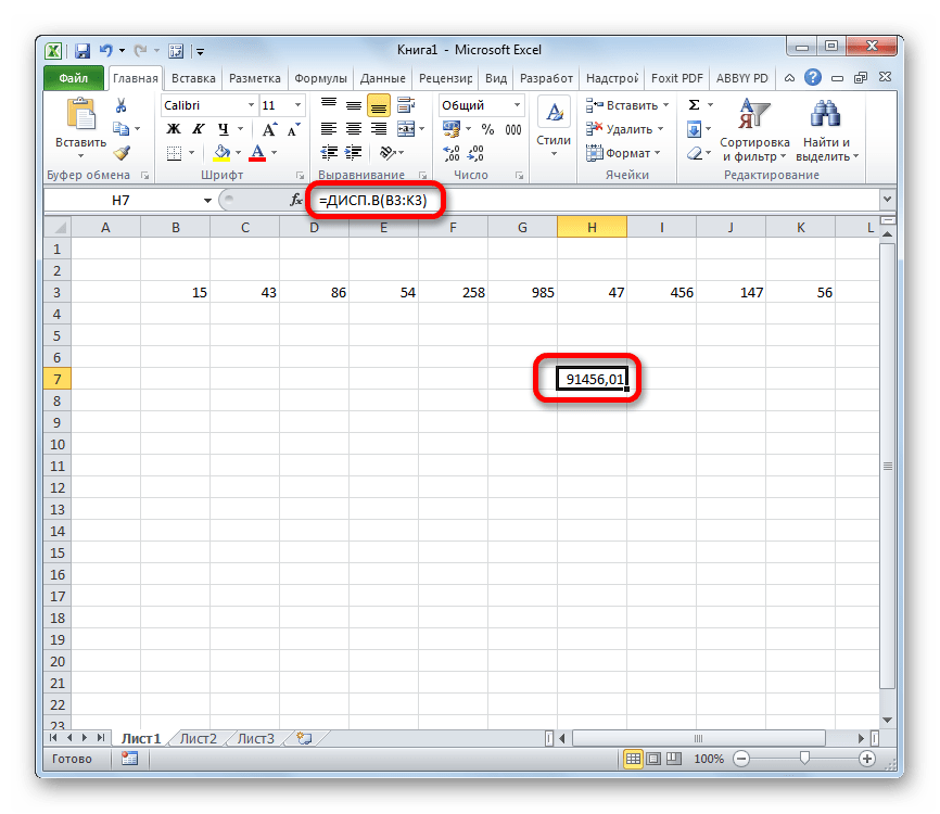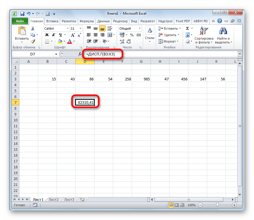 - Как видим, после этих действий производится расчет. Итог вычисления величины дисперсии по генеральной совокупности выводится в предварительно указанную ячейку. Это именно та ячейка, в которой непосредственно находится формула ДИСП.Г.